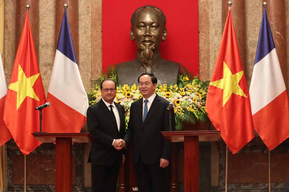 Chủ tịch nước Trần Đại Quang chào mừng Tổng thống Hollande thăm cấp Nhà nước tới Việt Nam, đánh giá cao ý nghĩa của chuyến thăm đối với quan hệ hai nước. Tổng thống Hollande bày tỏ vui mừng tới thăm đất nước Việt Nam tươi đẹp, khẳng định mong muốn chuyến thăm sẽ thúc đẩy hơn nữa quan hệ Đối tác chiến lược giữa hai nước.