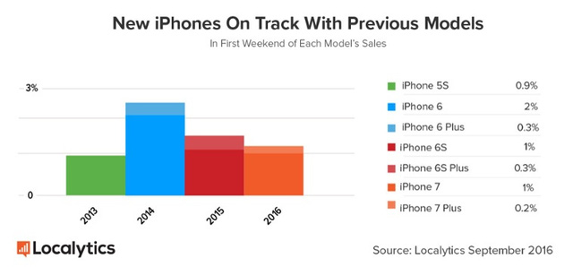 Trong tuần đầu tiên, iPhone 7 chiếm khoảng 1% trong tổng số iPhone đang kích hoạt. Còn iPhone 7 Plus là 0,2%, tổng số là 1,2%. Tương đương với tỷ lệ iPhone 6s và 6s Plus được bán ra vào năm ngoái, với các con số 1% và 0,3% tương ứng.