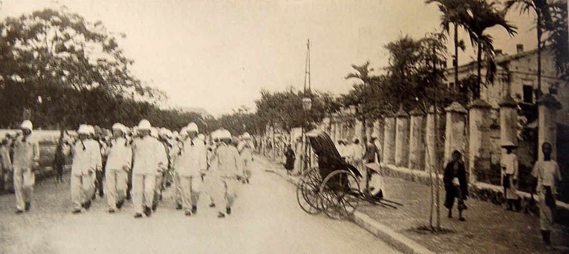 Một nhóm binh sĩ hải quân Pháp trên đường phố Sài Gòn. Hình ảnh nằm trong loạt ảnh Đông Dương năm 1901 do nhiếp ảnh gia người Pháp Jules Gervais-Courtellemont thực hiện.