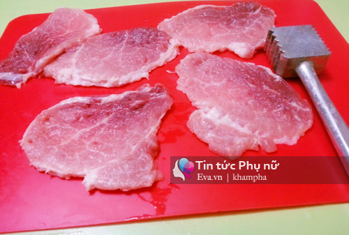 Bước 1 : Cho thịt ra thớt rồi dùng dụng cụ đập thịt đập cho miếng thịt mỏng và làm thịt mềm hơn.