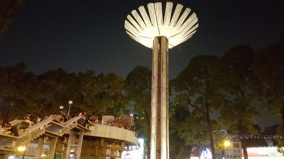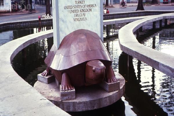 Ngoài ra, khu vực trung tâm còn có một cột cao mang hình cánh hoa xòe phía trên. Cột cao này được xem như một chiếc đinh lớn đóng xuống giữa hồ để ghim đuôi rồng lại. Năm 1972, Công trường Chiến trị trận vong được đổi thành Công trường quốc tế. Vào đầu năm 1976, tấm bia và con rùa bị phá hủy trong một vụ nổ. Tuy con rùa không còn nhưng người dân vẫn quen gọi là hồ Con Rùa, thay cho tên gọi chính thức.