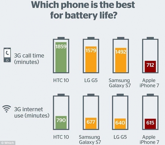 iPhone 7 vừa ra đời đã bị đánh giá thua kém cả 3 smartphone Android đối thủ là Samsung Galaxy S7, HTC 10 và LG G5 về thời lượng pin. Mặc dù trước đó Apple tự hào khoe với thế giới rằng, iPhone 7 được trang bị "thời lượng pin tốt nhất từ trước tới nay đối với bất kỳ smartphone nào từng phát hành". Một cuộc kiểm tra mới của trang Which? (Anh) đã bị đánh giá khiến các đệ tử của iPhone bất ngờ.