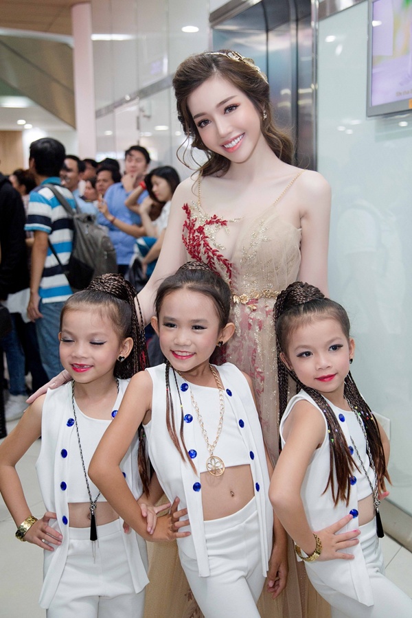 Elly Trần còn tạo dáng bên cạnh các diễn viên nhí trong bộ phim "Bí ẩn song sinh" mà mình góp mặt.