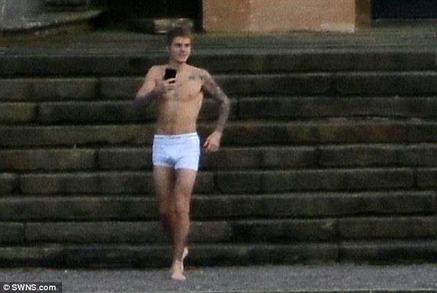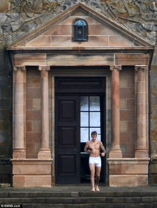 Justin Bieber chỉ mặc mỗi quần lót khi bước ra khỏi dinh thự. Ngôi sao người Canada thuê dinh thự khổng lồ khi đến Scotland lưu diễn