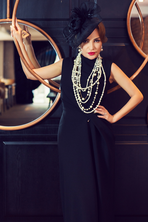 Trong một kiểu ảnh khác, Thanh Hà diện đầm suông dáng kết hợp dây chuyền ngọc trai và mũ cách điệu.