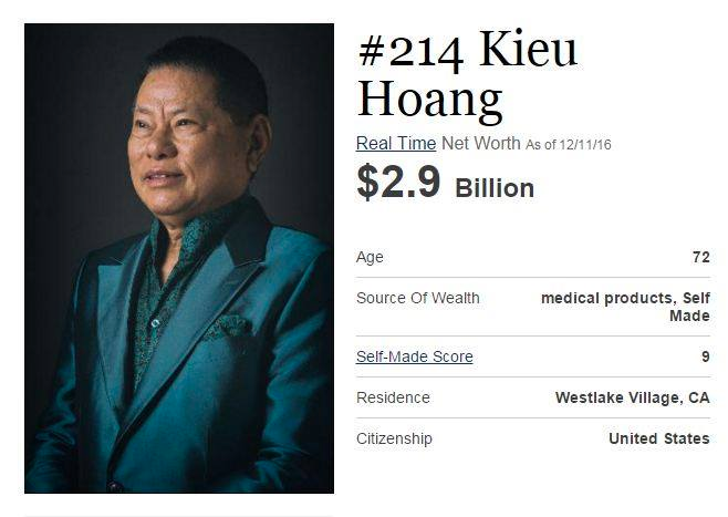 Hoàng Kiều xếp thứ 214 trong danh sách 400 người giàu nhất nước Mỹ của Forbes (Thống kê vào ngày 11/12/2016)