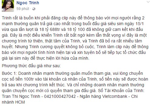 clip này để thông báo với mọi người rằng 2 mạnh thường quân trả giá cao nhất trong buổi đấu giá siêu sim ngày 15/1 vừa qua lần lượt là 18 tỷ 688triệu và 18 tỷ 100 đã không giữ cam kết khi đấu giá. Đây là một điều khiến Trinh rất bất ngờ kèm lẫn thất vọng vì đây là một chương trình từ thiện, thật tâm của Trinh, và Trinh đã bỏ ra rất nhiều tâm huyết. Nhưng Trinh cương quyết không bỏ cuộc, Trinh làm clip này để thông báo với mọi người tình hình hiện tại và xin tuyên bố sẽ tiếp tục tổ chức đấu giá lại sim này để thực hiện lời hứa của mình...". Sau đó Ngọc Trinh cũng lại hẹn vào lúc 19h ngày 19.1 để tổ chức đấu giá "live stream", tức là ngày 22 âm lịch.