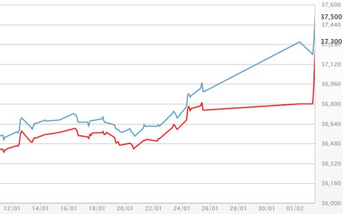 Trước đó, giá vàng SJC bán ra tại DOJI có lúc lên mức 37,65 triệu đồng/lượng, cao nhất từ đầu tháng 7 năm ngoái. Nếu so với trước khi nghỉ Tết, giá vàng hiện tăng khoảng 600.000 đồng/lượng.