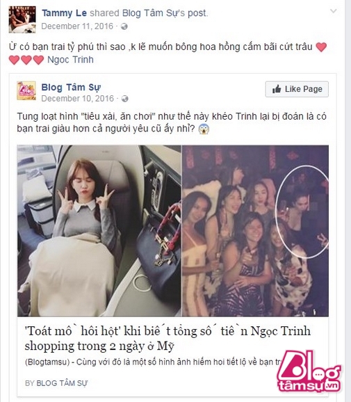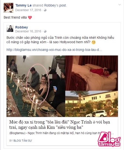 Lúc Ngọc Trinh sang Mỹ ra mắt gia đình Hoàng Kiều, cô còn đi cùng cả với bạn thân của mình, một trong số đó là người đẹp Tammy Lê. Cô gái này sở hữu thân hình nóng bỏng, gương mặt cũng khá ưa nhìn. Đặc biệt trên trang cá nhân của mình, Tammy Lê đã đăng ảnh, giới thiệu là ăn tối trong villa của bạn thân, cùng với đó là vô vàn lời tự hào khi Ngọc Trinh yêu được tỷ phú người Việt giàu nhất thế giới. Tuy nhiên, từ lúc Ngọc Trinh chia tay cô nàng lại hoàn toàn im lặng, không hề phát ngôn gì thêm về chuyện tình của bạn thân. Mãi tới hôm nay 13/2 cô mới chịu lên tiếng về chuyện tình của Nữ hoàng nội y.