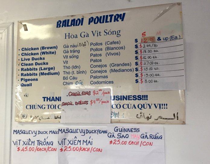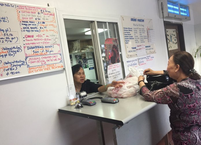 “Mỗi ngày bán ra số gà nâu, mà người Mỹ gọi là chicken brown, tức gà đi bộ, nhiều hơn bán gà trắng, hay gọi là chicken white, nghĩa là gà Mỹ. Bởi vì gà đi bộ bán nguyên con với giá cố định, còn gà Mỹ thì tính giá theo pound nên thường lẻ tẻ,” bà Nguyễn Lệ Tiên, nhân viên tiệm gà vịt sống Baladi Poultry, cho biết.