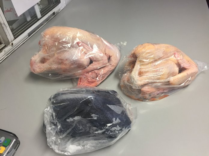 “Sau khi gà được làm sạch lông thì các nhân viên làm gà bắt đầu mổ bụng để làm đồ lòng cho sạch sẽ. Khi đồ lòng được làm sạch, và gà được máy xoáy cho bớt nước trong con gà thì lấy đồ lòng để lại vào bụng, rồi bỏ vô bọc. Riêng với gà không bán nguyên con mà bán từng miếng thì việc chặt gà, cắt bỏ đầu, bỏ chân… đều được máy làm,” ông giới thiệu.
