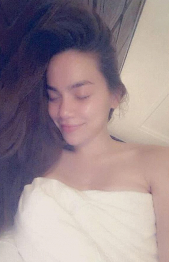 Hồ Ngọc Hà vẫn để nguyên khăn tắm và khép hờ mắt để tận hưởng phút giây thư giãn trong phòng tắm.