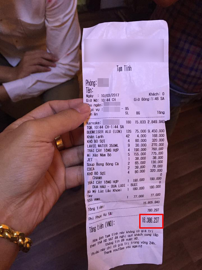 Hóa đơn được xuất ra có ghi rõ nhóm B.T đã dùng hết 126 lon bia, mỗi lon có giá 75.000 đồng. 42 chiếc khăn lạnh và rất nhiều những món ăn được tính theo giá dịch vụ trong phòng karaoke như trái cây, mì xào bò nấm, bò khô, bong bóng cá, bò Mỹ lúc lắc...