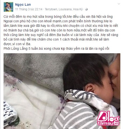 Cô chia sẻ: “Tính mẹ xưa giờ đã hay lo rồi, nhiều khi chuyện có chút xíu mà mẹ lo riết nó thành bự chà bá, giờ có con mẹ còn lo hơn nữa”. Thậm chí “1 vết đỏ trên da con thôi cũng làm mẹ suy nghĩ cả đêm”. Chính vì sự bất an, phiền lòng cả ngày lẫn đêm thế này cho nên dù được chồng chăm sóc tận tình, Ngọc Lan vẫn không thế thấy thoải mái, vui vẻ.