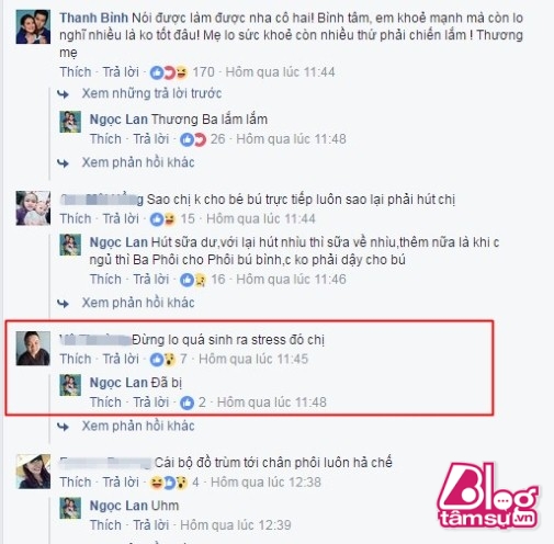 Dòng trạng thái của nữ diễn viên nhận được sự động viên của ông xã và rất nhiều người hâm mộ. Ngọc Lan cũng thừa nhận vì quá lo lắng nên cô đã bị stress sau sinh – chứng bệnh mà rất nhiều bà mẹ bỉm sữa gặp phải.