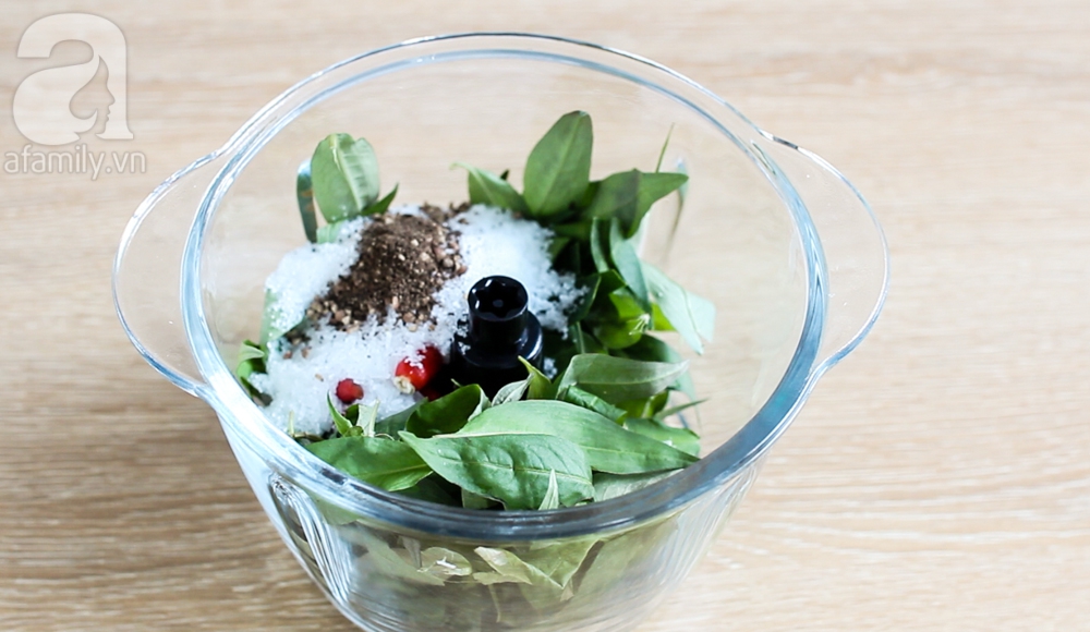 Cho rau răm, ớt, lá chanh, muối, đường, bột ngọt, tiêu vào máy xay.
