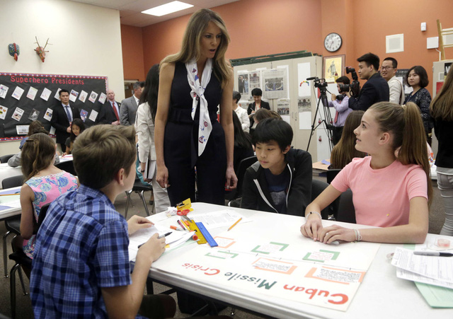 Đệ nhất phu nhân Mỹ không xuất hiện thường xuyên trước công chúng kể từ khi chồng bà nhậm chức, nhưng thỉnh thoảng tham gia các sự kiện chính thức tại Nhà Trắng. Trong ảnh, bà tới thăm một trường học ở thủ đô Washington.