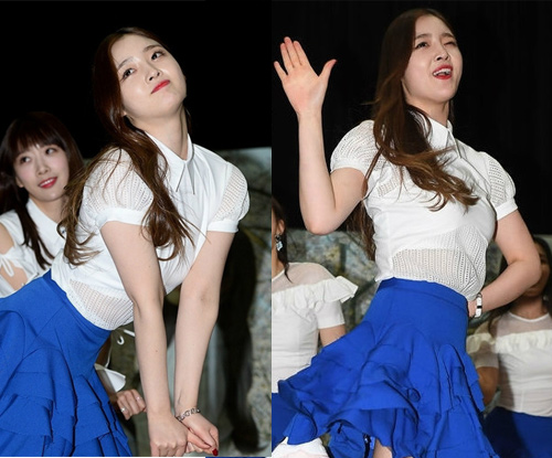 Ở một vài khoảnh khắc nghỉ của bài hát, Eunjin đã nhanh trí đưa tay chỉnh áo nhưng vì thời gian quá gấp rút nên chưa kịp chỉnh xong, cô nàng lại phải tiếp tục biểu diễn cùng các thành viên còn lại.