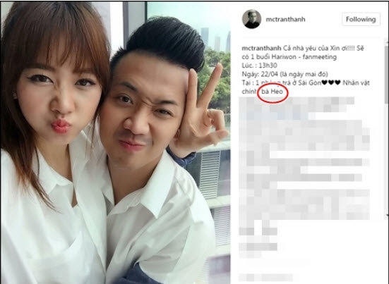 Hầu hết các dòng trạng thái chia sẻ trên mạng xã hội viết về vợ Hari Won, Trấn Thành đã đặt riêng cho Hari Won biệt danh là heo. Có lẽ, đó là do thời điểm Trấn Thành và Hari Won bắt đầu quen nhau, yêu nhau, nữ ca sĩ đang sở hữu cân nặng đáng kể. Thân hình cô khá mập mạp.