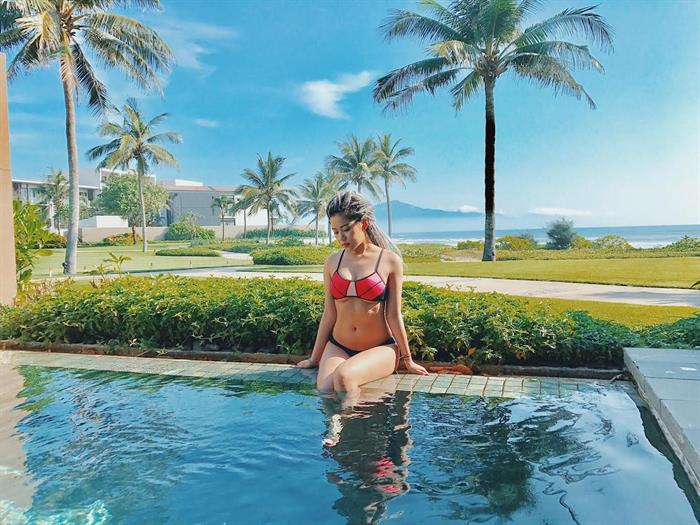 Trước đó, trong chuyến đi du lịch ở Đà Nẵng, cô nàng cũng "đốt mắt" người hâm mộ khi chia sẻ những hình ảnh mặc bikini chụp hình trong hồ bơi ướt sũng.