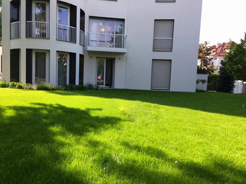 Sân vườn xanh tươi với cỏ được cắt tỉa tỉ mỉ, mát mắt.