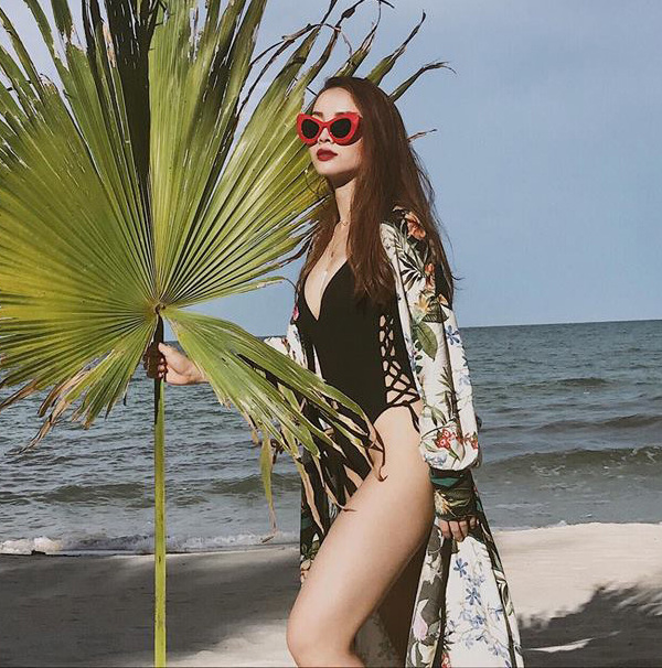 Áo bơi kiểu retro dáng corset giúp Lan Khuê trông đầy đặn hơn.