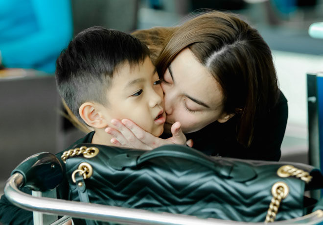 Nữ ca sĩ tranh thủ ôm nựng con trai trong lúc tất bật thu xếp hành lý.