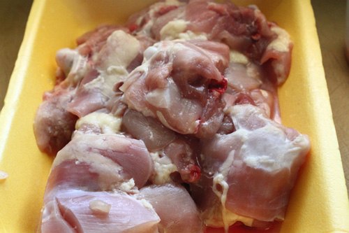 - Bước 1 (sơ chế nguyên liệu): Thịt gà xát muối, rửa sạch, chặt miếng vừa ăn. Ướp thịt gà với 2 thìa hạt nêm, 1 thìa nhỏ muối trong khoảng 30 phút.