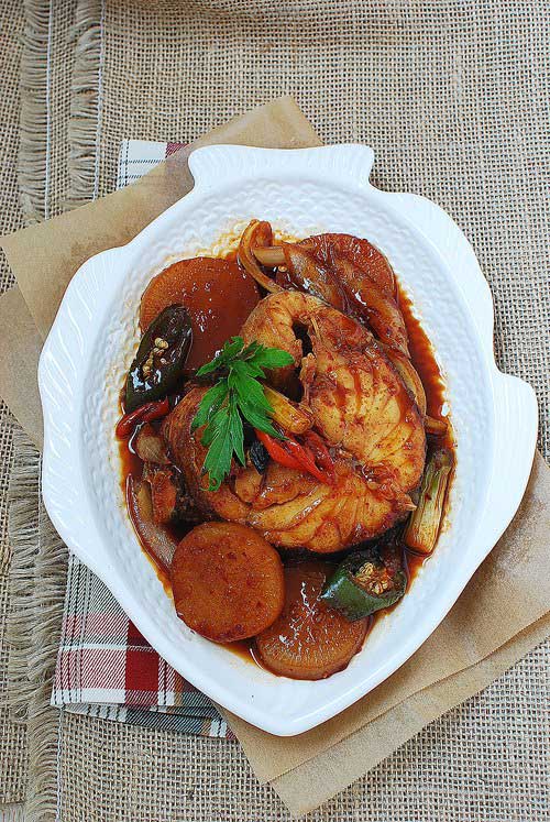- Cho cá vào nồi, đun khoảng 5-10 phút tùy vào độ dày của cá, sau đó lật lại và đun thêm 5-10 phút nữa, vừa đun vừa múc nước sốt xối liên tục lên cá.