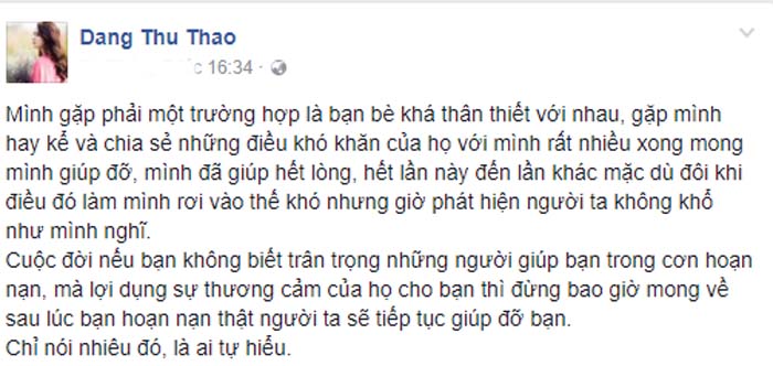 Dù rất bức xúc khi lòng tốt bị lợi dụng, nhưng Đặng Thu Thảo không công khai danh tính người bạn. Thay vào đó, cô nhắn nhủ sâu cay: "Cuộc đời nếu bạn không biết trân trọng những người đã giúp mình trong cơn hoạn nạn mà lại lợi dụng sự thương cảm của họ dành cho bạn thì đừng bao giờ mong về sau lúc hoạn nạn thật người ta sẽ tiếp tục giúp đỡ. Chỉ nói nhiêu đó, là ai tự hiểu".