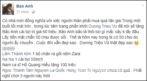 Mới đây, Bảo Anh bất ngờ chia sẻ trên trang Facebook cá nhân: "Có nhà mới đồng nghĩa với việc người thân phải mua quà tân gia. Trong một buổi tối mát trời, trong lúc tâm trạng phấn khởi Dương Triệu Vũ đã nói sẽ tặng Bảo Anh cái tivi trị giá 60 triệu. Bảo Anh bảo là thôi tivi gì mắc vậy không lấy đâu. Lấy tiền mặt chẵn 50 triệu được rồi. Thế là hôm nay trong tài khoản có 50 triệu do người ấy chuyển. Cuộc đời vẫn đẹp sao. Dương Triệu Vũ thật đẹp sao". Sau đó, Dương Triệu Vũ cũng bình luận: "Hối hận cũng đã muộn màng.. Chúc mừng con có nhà mới.. rất hãnh diện vì đó hoàn toàn là công sức của Bảo Anh cày show".