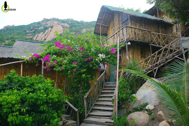 Từng căn hộ biệt lập đều hướng ra phía biển, xây dựng hoàn toàn bằng các vật liệu tự nhiên: sàn gỗ, mái lá, vách tre nứa cùng hoa giấy phủ kín lối vào.