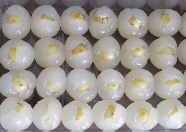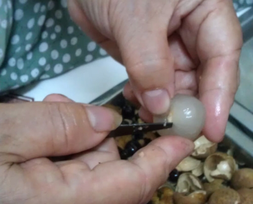 - Bước 3: Nhãn tươi bóc vỏ, dùng mũi dao nhọn lách quanh cuống để tách hạt ra. Hoặc bạn có thể lấy phần đuôi của chiếc thìa inox, xoáy quanh giữa phần hạt và phần cùi nhãn sẽ rất dễ dàng để tách phần hạt và cùi mà không sợ cùi bị rách.