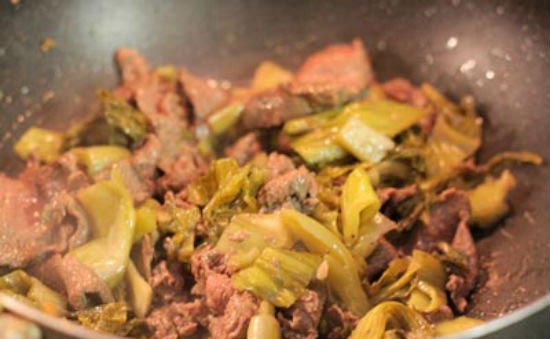 - Bước 3: Dùng lại chảo đó, rưới vào một ít dầu ăn, cho dưa cải chua vào xào nhanh tay lửa lớn, rưới vào một ít xì dầu, xào từ 3 đến 4 phút. Sau đó cho bát thịt bò vào đảo đều tay, đến khi hỗn hợp thịt bò và dưa cải chua quyện lẫn với nhau, thì trút ra bát lớn để qua một bên.