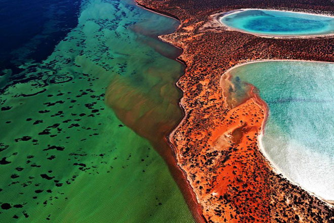 Cách thủ phủ Perth 800 km về phía tây của bờ biển Úc, Vịnh Cá mập với bờ biển đá vôi lượn sóng, những cồn cát trắng và những vách đá trải dài tới 1.500 km. Vịnh có nhiều bán đảo cạn và là nhà của 10.000 con bò biển, cá heo cùng nhiều loài bị đe doạ khác, với rừng cỏ biển đa dạng nhất thế giới.