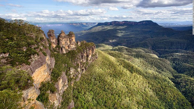 Kỳ quan độc đáo Núi xanh Blue Mountains cách Sydney hai giờ chạy xe, nằm trong danh sách di sản thiên nhiên thế giới. Đến đây, từ Đỉnh Tiếng Vang (Echo Point), bạn sẽ có dịp khám phá truyền thuyết về núi Ba Chị Em (Three Sisters) vươn lên từ cao nguyên sa thạch và hẻm núi sâu 760 mét.