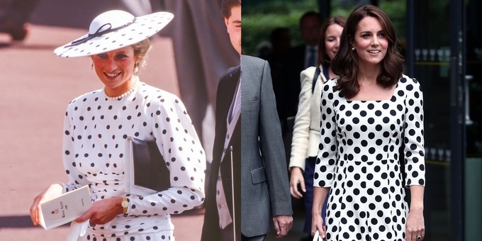 Ngày trước Công nương Diana diện đầm trắng chấm bi, kết hợp với mũ rộng vành đến tham dự cuộc đua Royal Ascot. Ngày nay Công nương Kate cũng chọn đầm tương tự đi xem giải quần vợt Wimbledon.