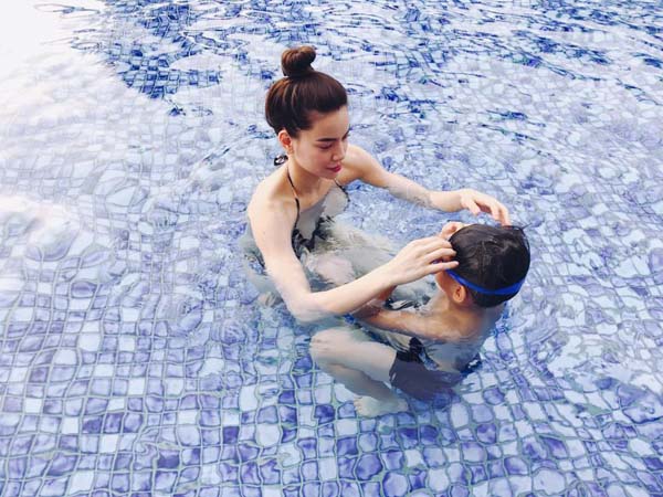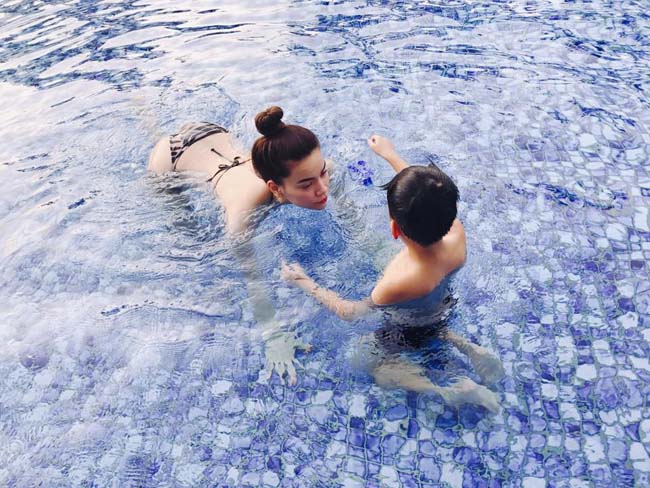 Bên dưới status là hình ảnh cô tự tin khoe dáng với đôi chân dài miên man cùng eo thon trông cực kỳ sexy và quyến rũ khi diện bộ bikini họa tiết kẻ sọc. Ngoài ra là những hình ảnh hai mẹ con nô đùa ở bể bơi.