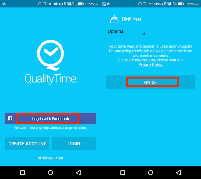 - Sau khi cài đặt QualityTime vào thiết bị, bạn có thể khởi động ứng dụng. Để bắt đầu hãy nhanh chóng chạm vào Log in with Facebook. Nếu muốn, bạn có thể tạo một tài khoản theo cách thủ công. Ngoài ra, bạn có thể sử dụng mà không cần đăng ký nhưng dữ liệu sẽ không được lưu lại.