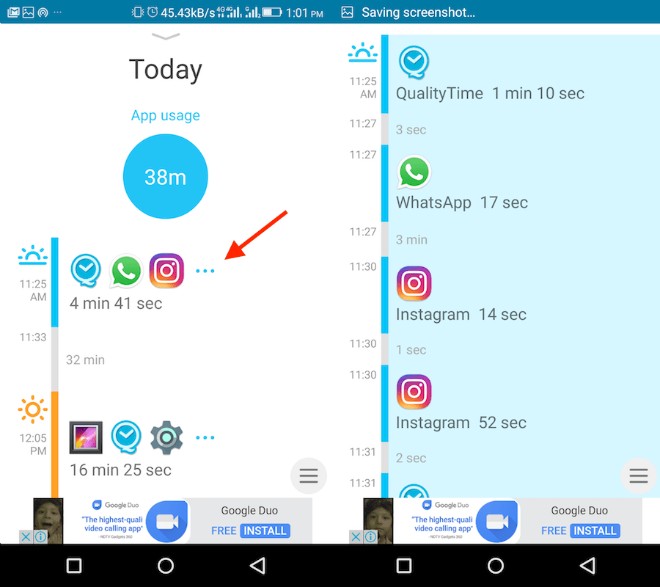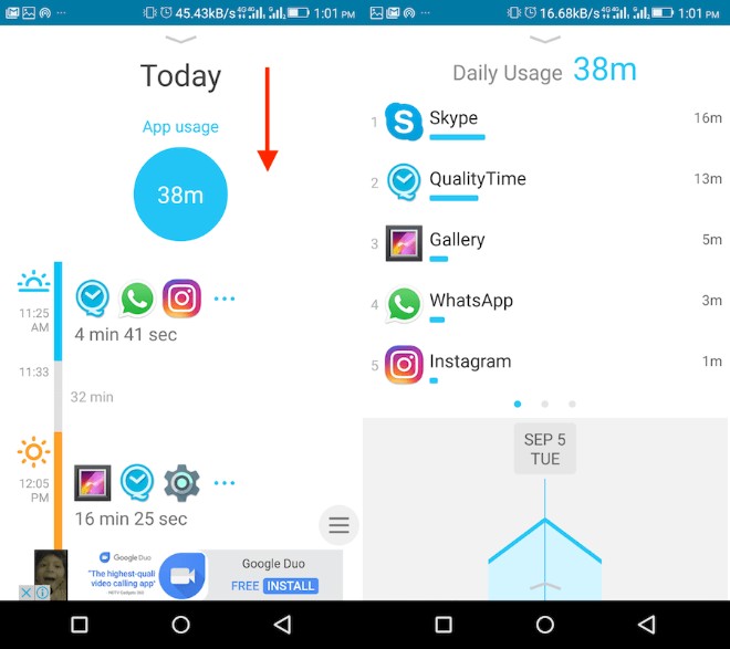 - Trở lại ứng dụng bạn sẽ thấy màn hình chính hiển thị tổng thời gian dành cho điện thoại. Nó cũng hiển thị dòng thời gian phân loại theo khoảng thời gian khác nhau mà bạn đã sử dụng điện thoại. Nhấn vào đó để xem cách sử dụng ứng dụng trong khoảng thời gian cụ thể.