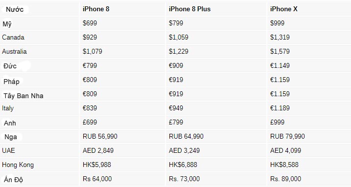 Cho tới hiện tại, Apple mới chỉ công bố giá khởi điểm của iPhone X, iPhone 8 và iPhone 8 Plus cho các phiên bản bộ nhớ thấp nhất 64GB. Dưới đây là giá của bộ ba smartphone này tại một số thị trường tiêu biểu, trong đó giá lên kệ của chúng tại Mỹ trong bảng dưới đây tạm thời rẻ nhất do chưa tính thuế giá trị gia tăng (VAT) bắt buộc, vốn thay đổi theo quy định của từng tiểu bang nước này. Giá bán iPhone X, iPhone 8 và iPhone 8 Plus ở các nước châu Âu đã bao gồm cả VAT.
