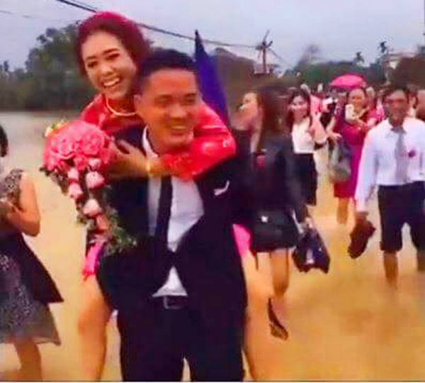 Hình ảnh chú rể cõng cô dâu trong cơn bão số 10 gây xôn xao cư dân mạng.