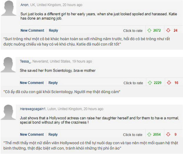 Khi xem những hình ảnh mới của Suri Cruise, nhiều độc giả trên Dailymail đã khen ngợi Katie Holmes quả là một người mẹ tốt. Suri giờ trông rất giản dị và đáng yêu, chứ không còn tập trung vào chuyện ăn diện se sua, hay tỏ thái độ sang chảnh như trước.