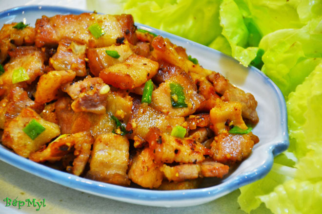 Thịt ba rọi rửa sạch, cắt miếng mỏng (khoảng 3-4mm) ướp thịt với 2 thìa nước mắm, 1 thìa nhỏ hạt nêm trong vòng 15 phút. Cho một ít dầu vào chảo, đun nóng già rồi cho thịt vào đảo đều đến khi thịt săn lại, chuyển thành màu vàng.