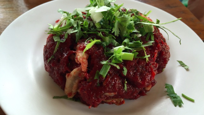 Tiết bò tươi chính là thứ khiến món ăn này trở thành kinh dị. Từ nguyên liệu đến màu sắc của món này đều khiến nhiều người ngai thử, nhưng cánh mày râu ở Thái Lan ưa chuộng và nó thường xuyên góp mặt trong các bữa tiệc nhậu, khi uống bia.