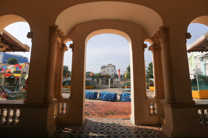 Khu hành lang với nét kiến trúc kiểu Pháp đặc trưng. Phần tường dày 20cm, bó nền bằng gạch thẻ, ốp đá da quy, nền lót gạch bông.