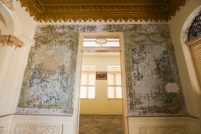 Đặc biệt, trên vách tường ở gian tiền sảnh là bốn bức tranh tường đối diện nhau. Mỗi bức có kích thước 2,4 m2 hiện đã lu mờ, mất hết chi tiết, màu sắc, vì bị cạo sửa, sơn phết chồng lên sau những lần sửa nhà. Những bức tranh chạm hình chim muông, hoa lá, cảnh quan miền sông nước...