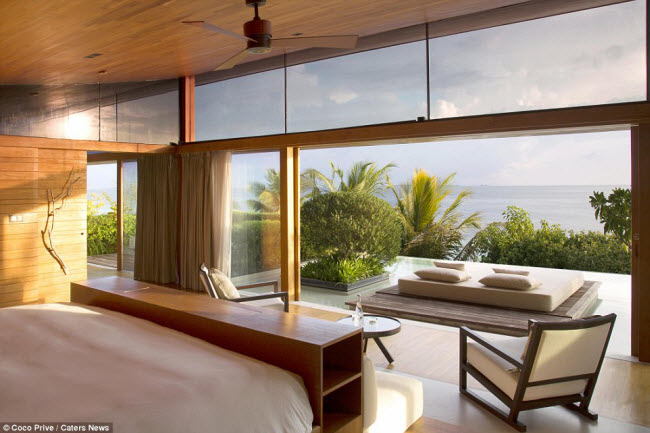 Một trong những phòng ngủ có hướng nhìn thẳng ra biển. Hòn đảo nghỉ dưỡng này cũng có nhiều cây nhiệt đới như xoài, dừa, cọ, hoa đại, dâm bụt và hoa giấy.