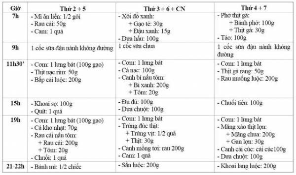 Nhóm thức ăn nên dùng: Các loại bánh mì không pha phụ gia, gạo, mì sợi: số lượng vừa phải; sữa tách béo, lòng trắng trứng gà, các loại thịt nạc, thịt gà bỏ da, các loại cá ít béo, các loại rau xanh có lượng đường thấp: các loại rau cải, mồng tơi, bí bầu, mướp, dưa chuột...