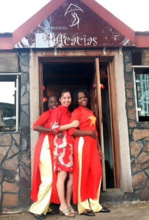 Chị Hương và hai nhân viên mặc áo dài hình cờ đỏ sao vàng trước nhà hàng Acacias.